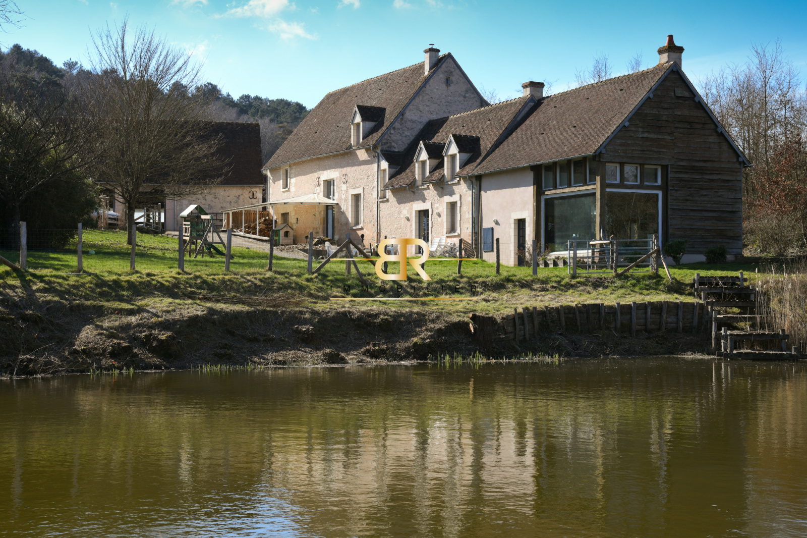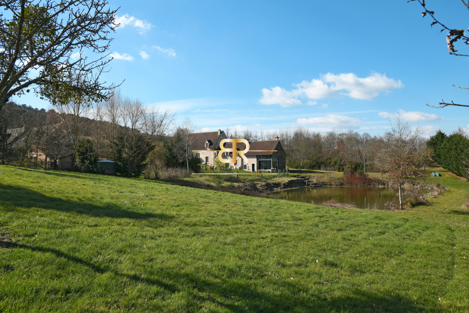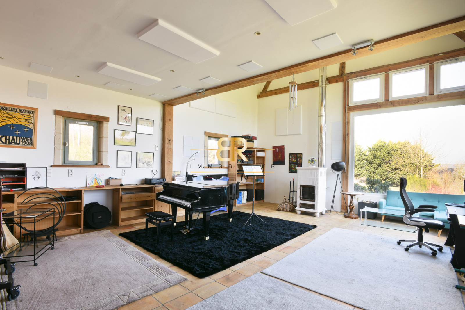 - Salon : 48 m² avec baies vitrées offrant une vue sur étang et jardin, hauteur sous faitage de 8m.