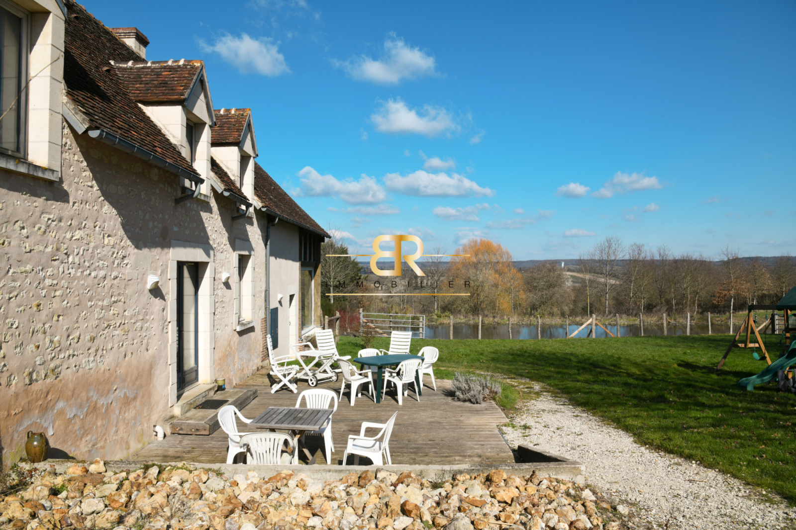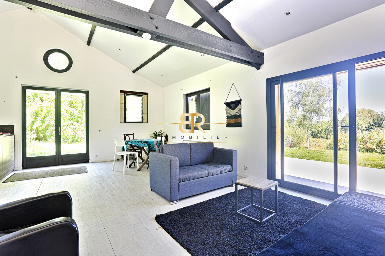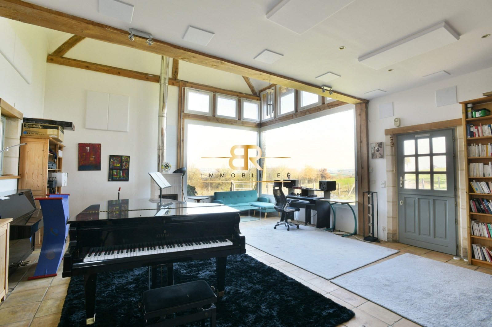 - Salon : 48 m² avec baies vitrées offrant une vue sur étang et jardin, hauteur sous faitage de 8m.