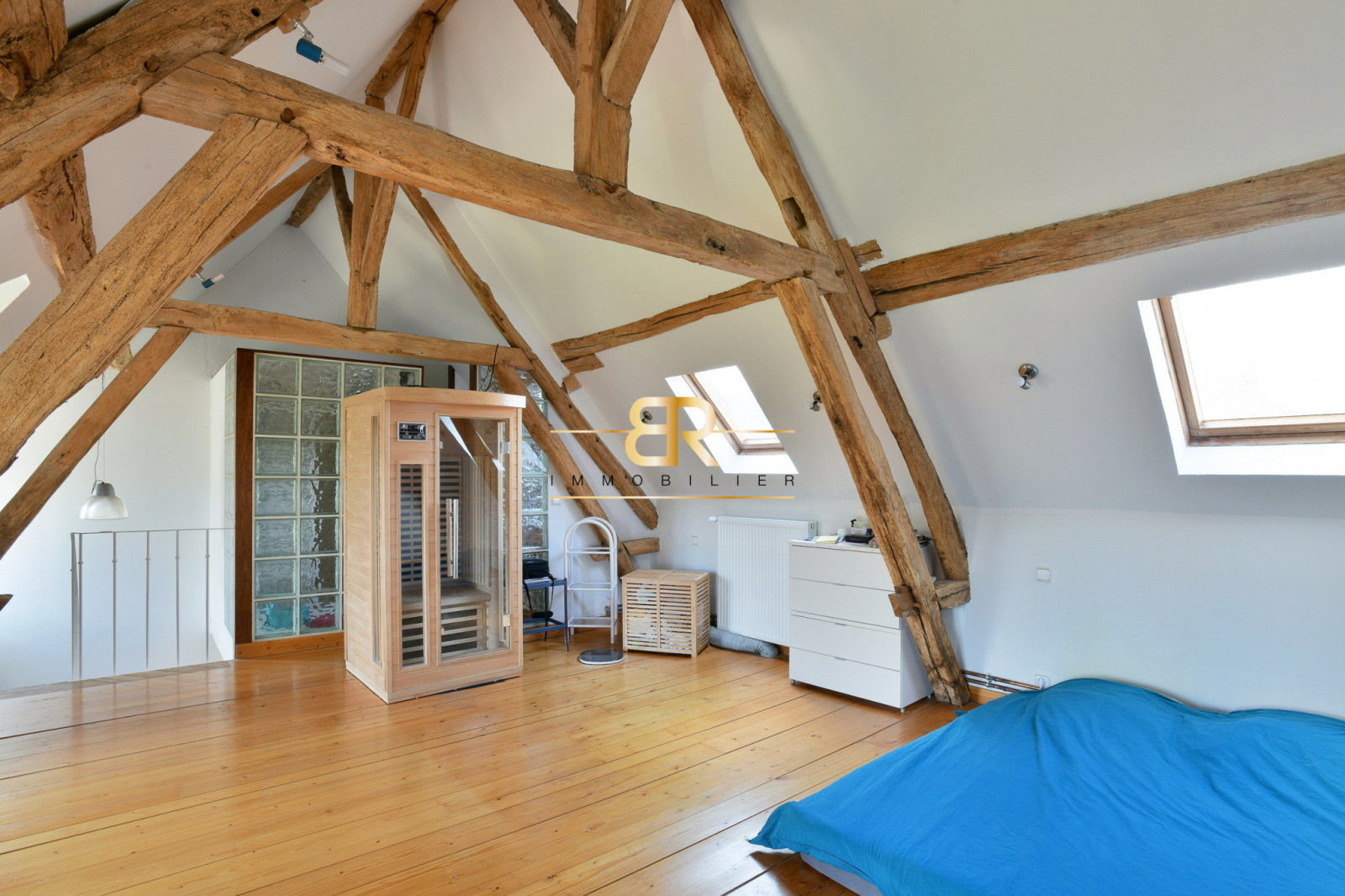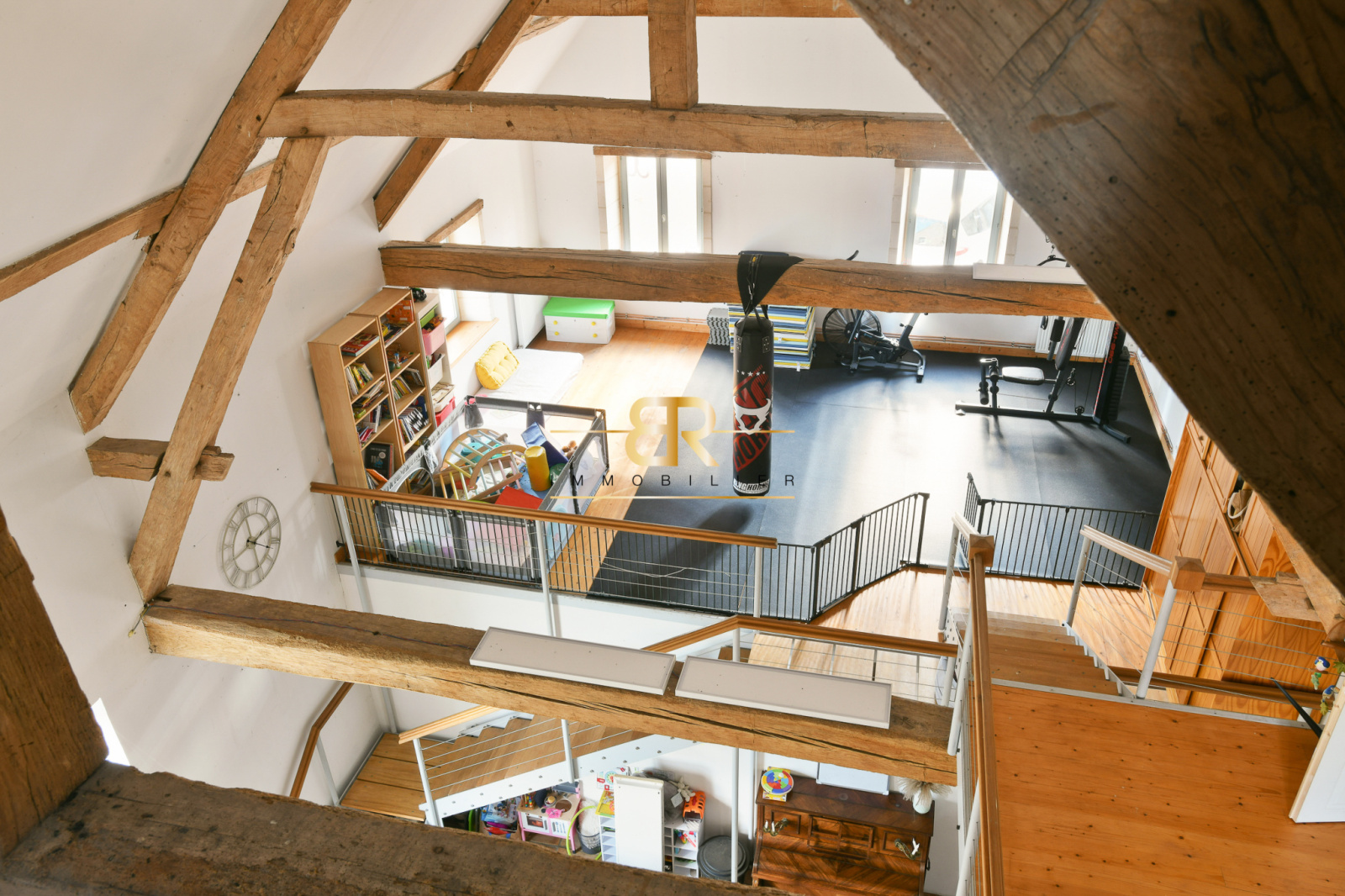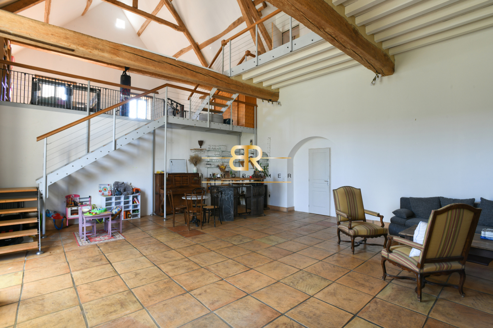 - Mezzanine : Salon de 72 m² avec hauteur sous faitage de 9m50.