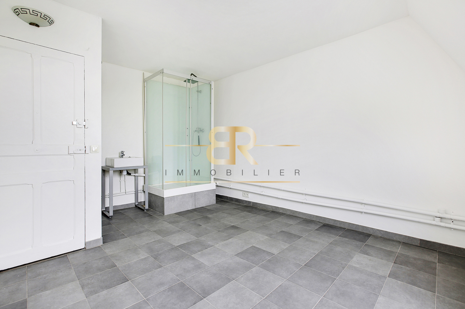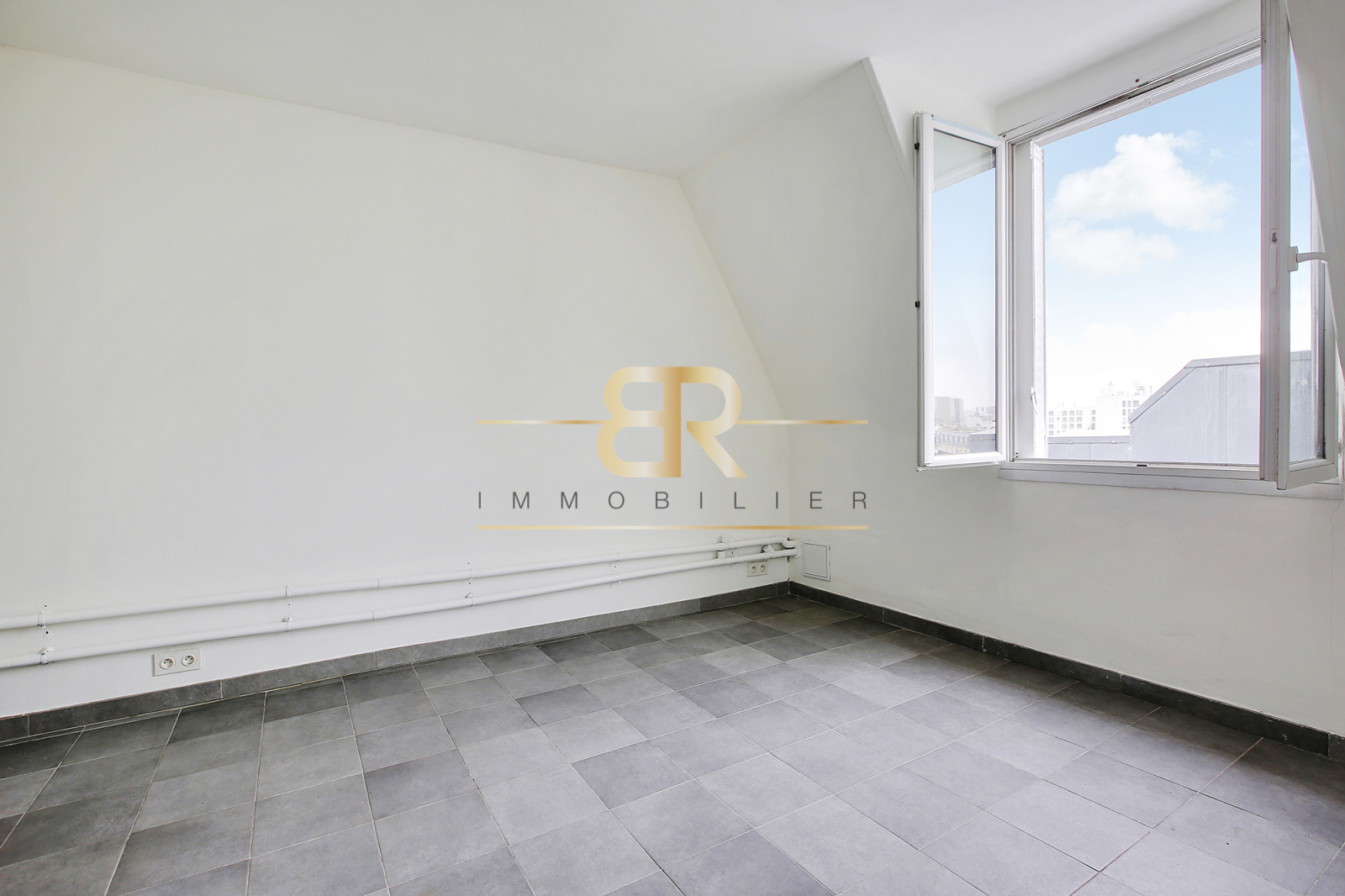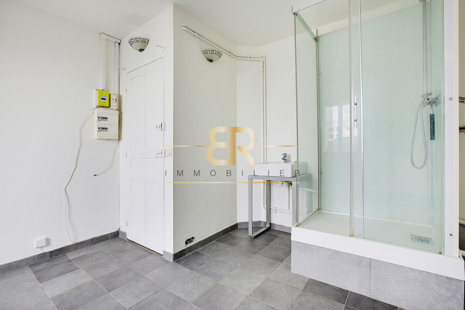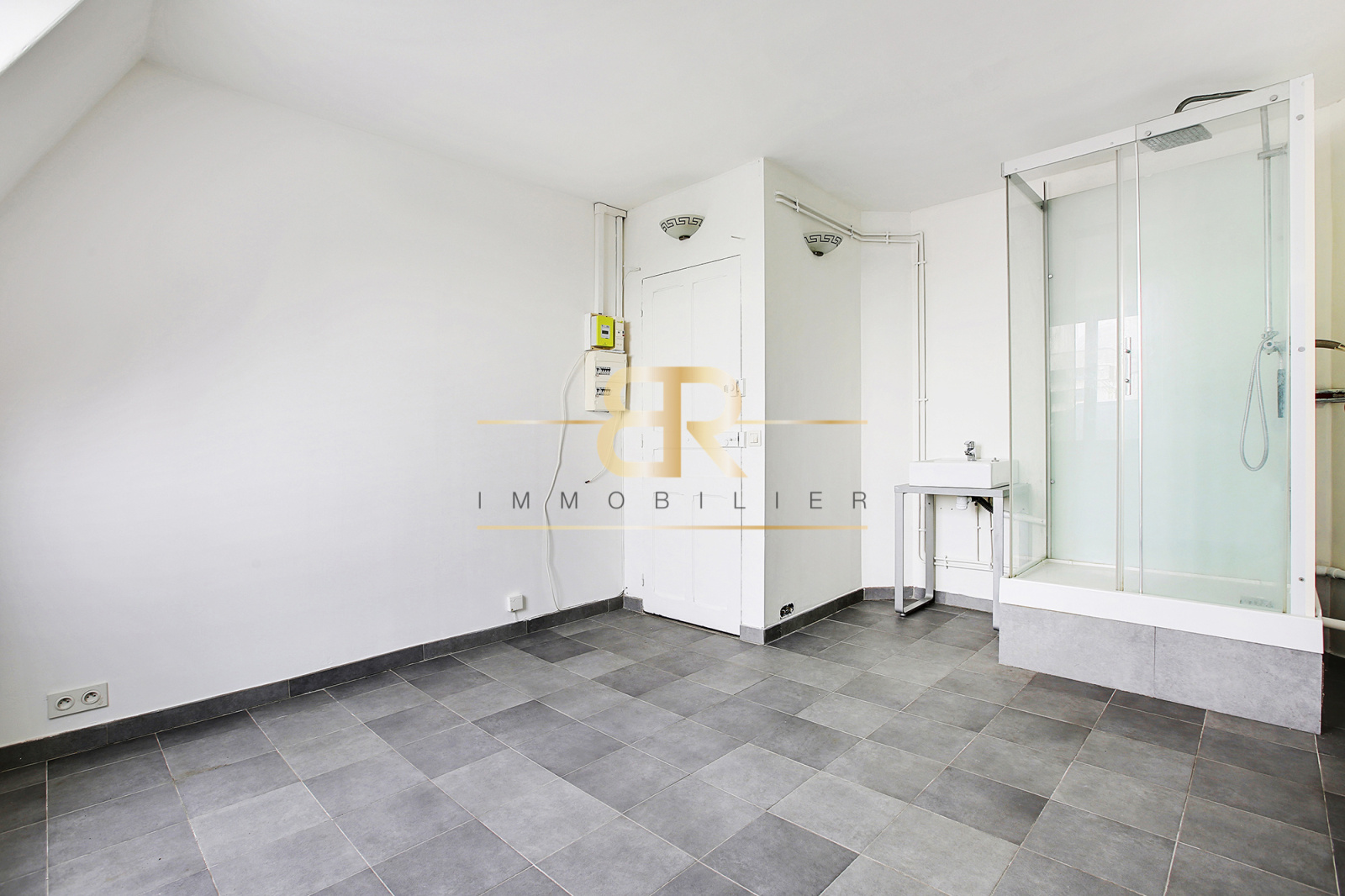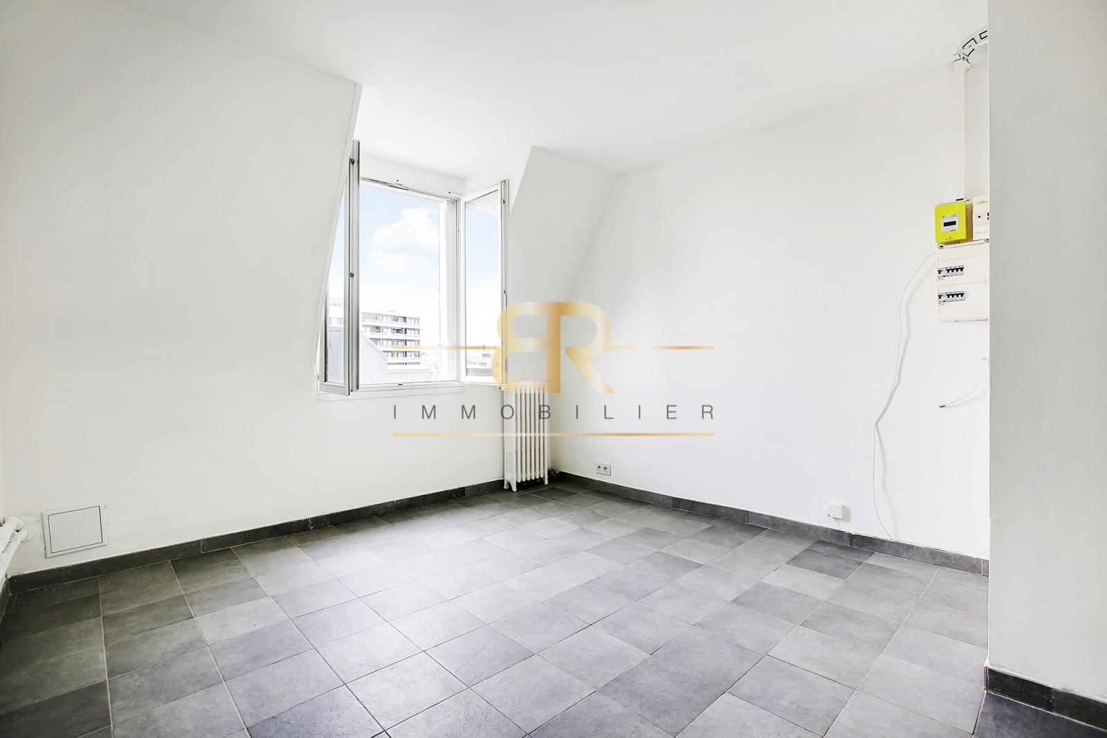 LUMINEUX (exposition SUD), studio REFAIT À NEUF ( électricité, peinture, fenêtre double vitrage, cloisonnement des murs, sol carrelé et isolé, douche ), VUE IMPRENABLE sur la place Félix Eboué, belle hauteur sous plafond de 2,57 m.