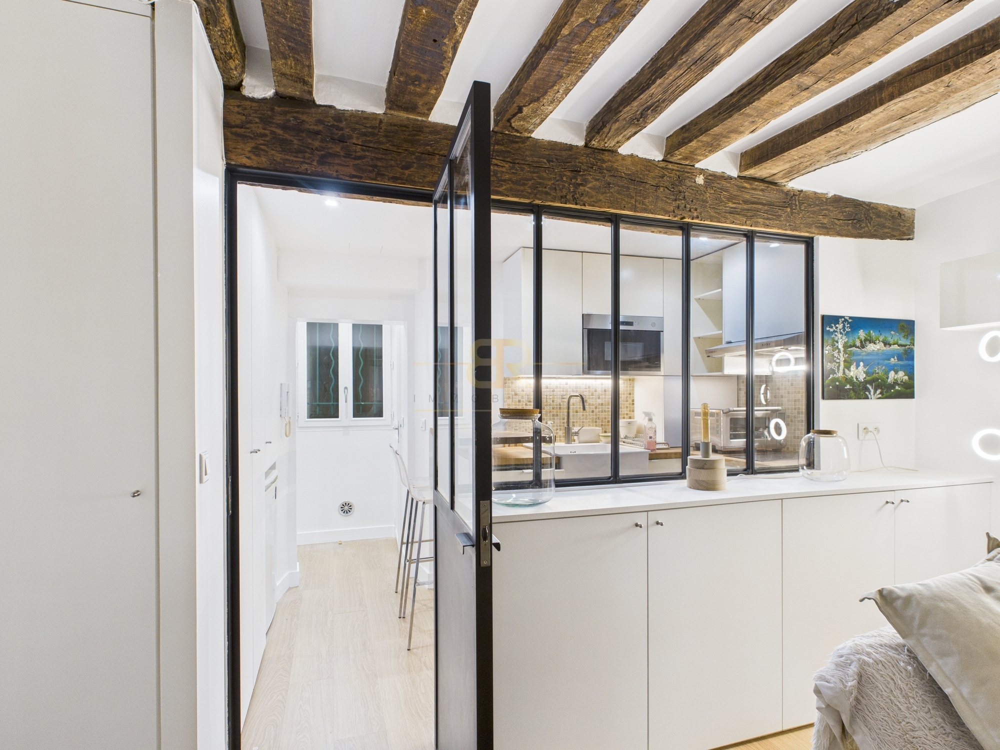 L’appartement se compose d’un petit couloir d’entrée menant à une cuisine américaine aménagée, séparée de la pièce principale par une vitrine en verre, apportant luminosité et caractère à l’espace.