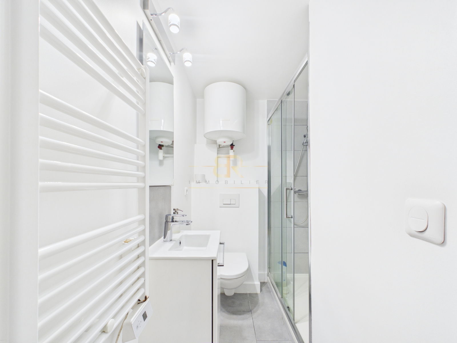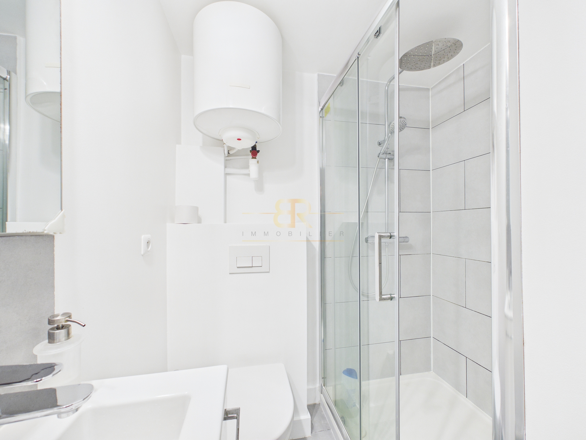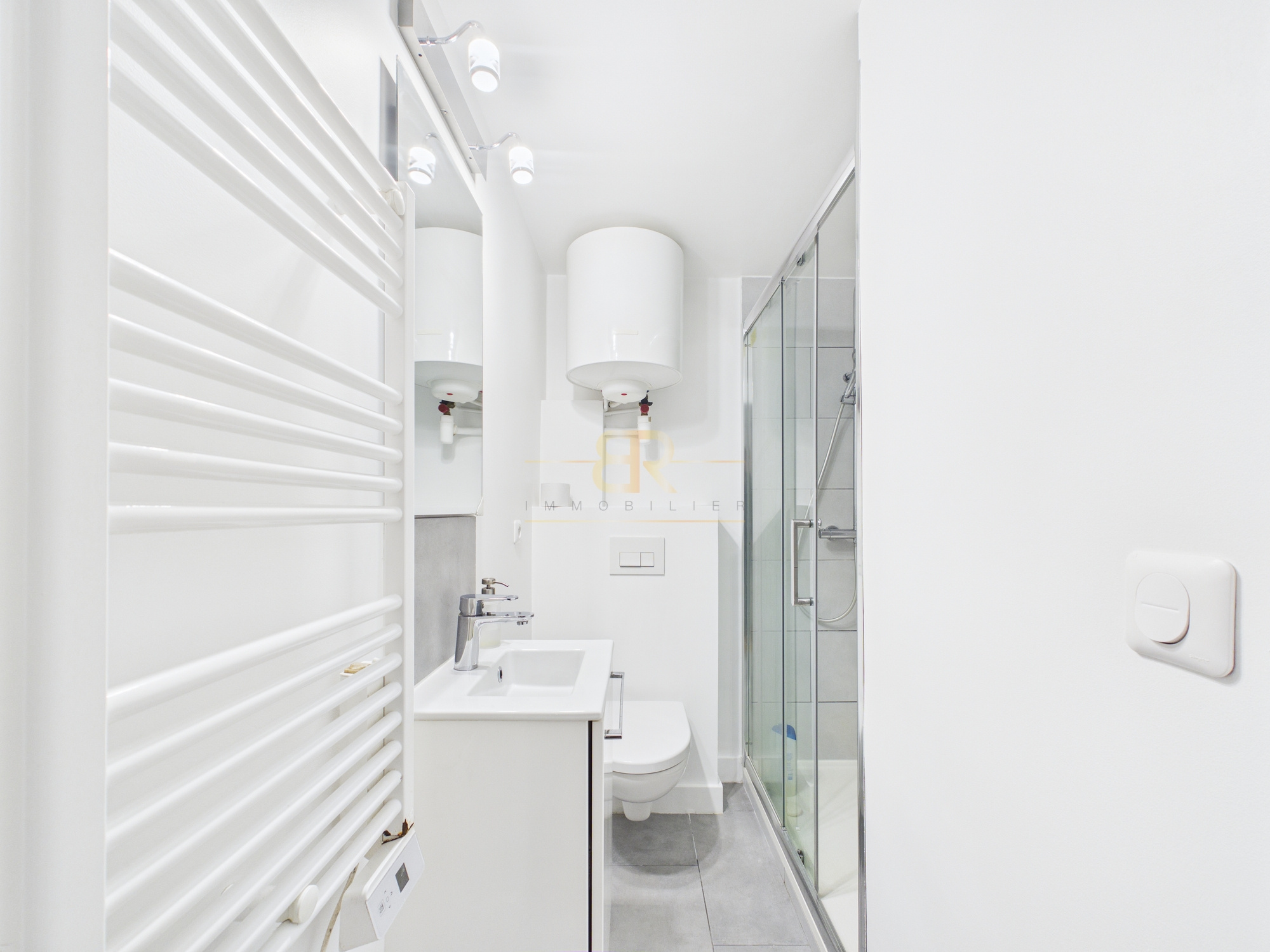 Ce studio de 16,68 m² Carrez, bien agencé, se compose d’une petite entrée donnant accès à un espace cuisine équipée avec machine à laver, de placards sur mesure ainsi que d’un espace de vie avec canapé-lit et table basse. En face de l’entrée se trouve une salle d’eau avec douche et WC.