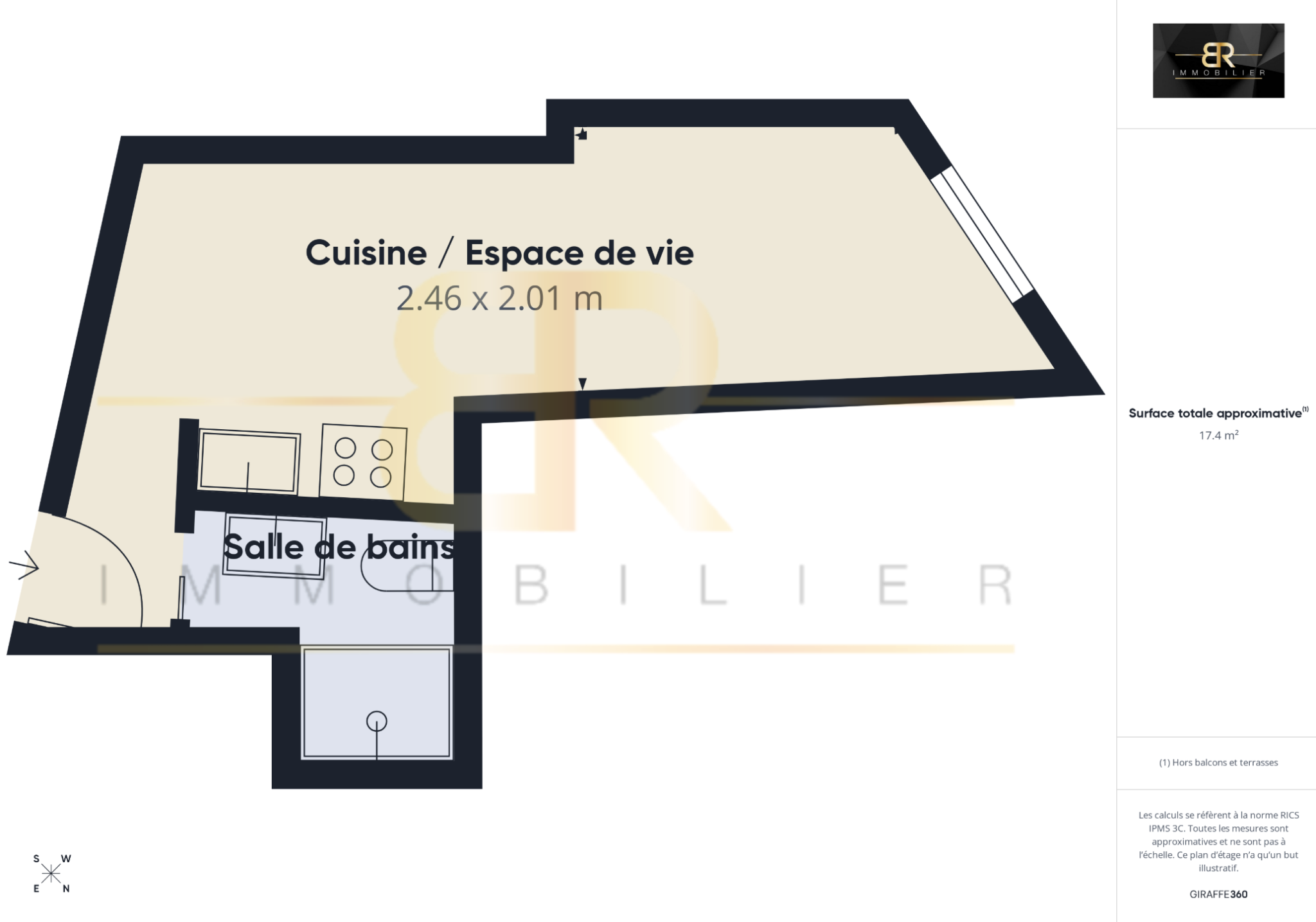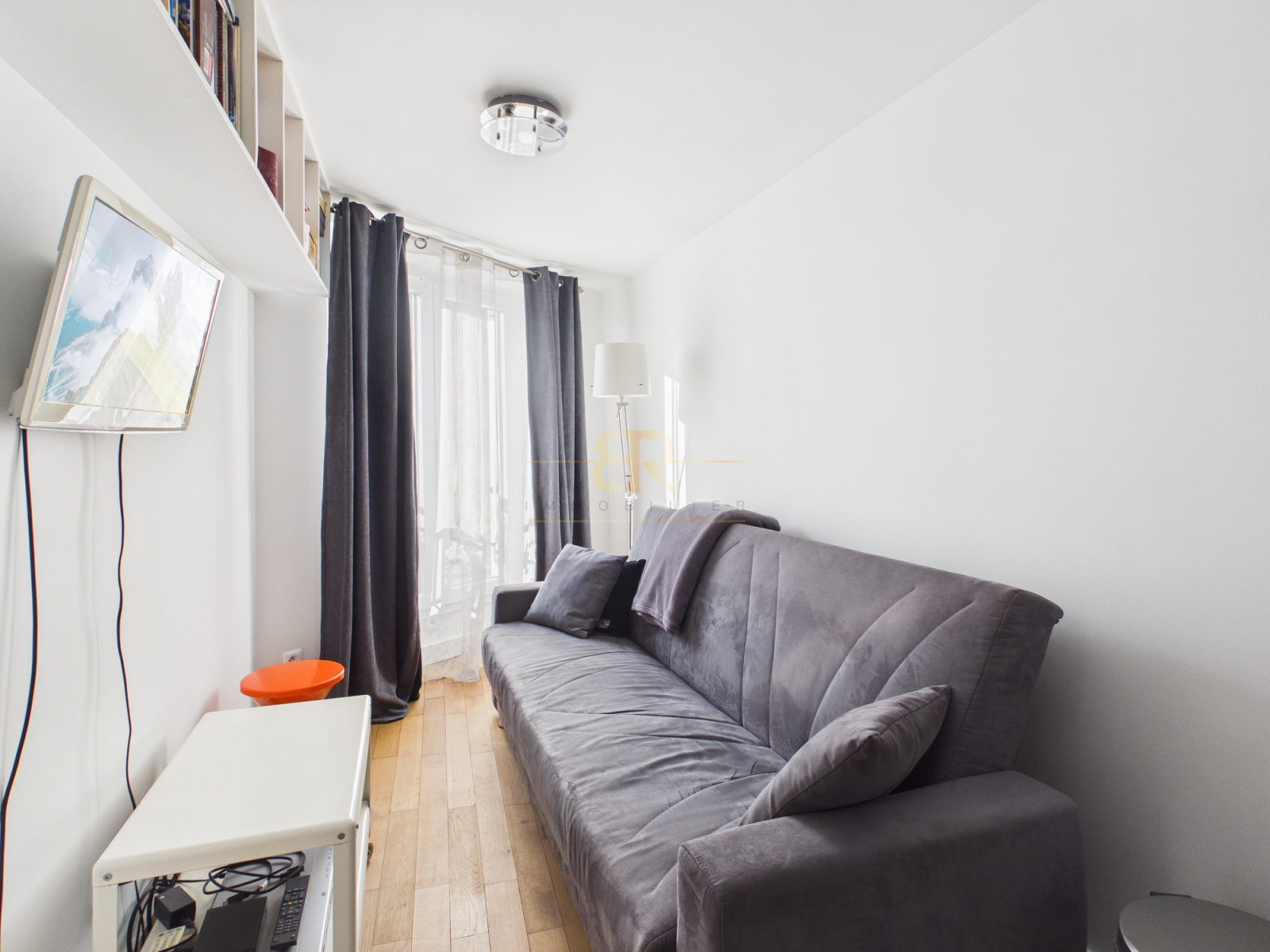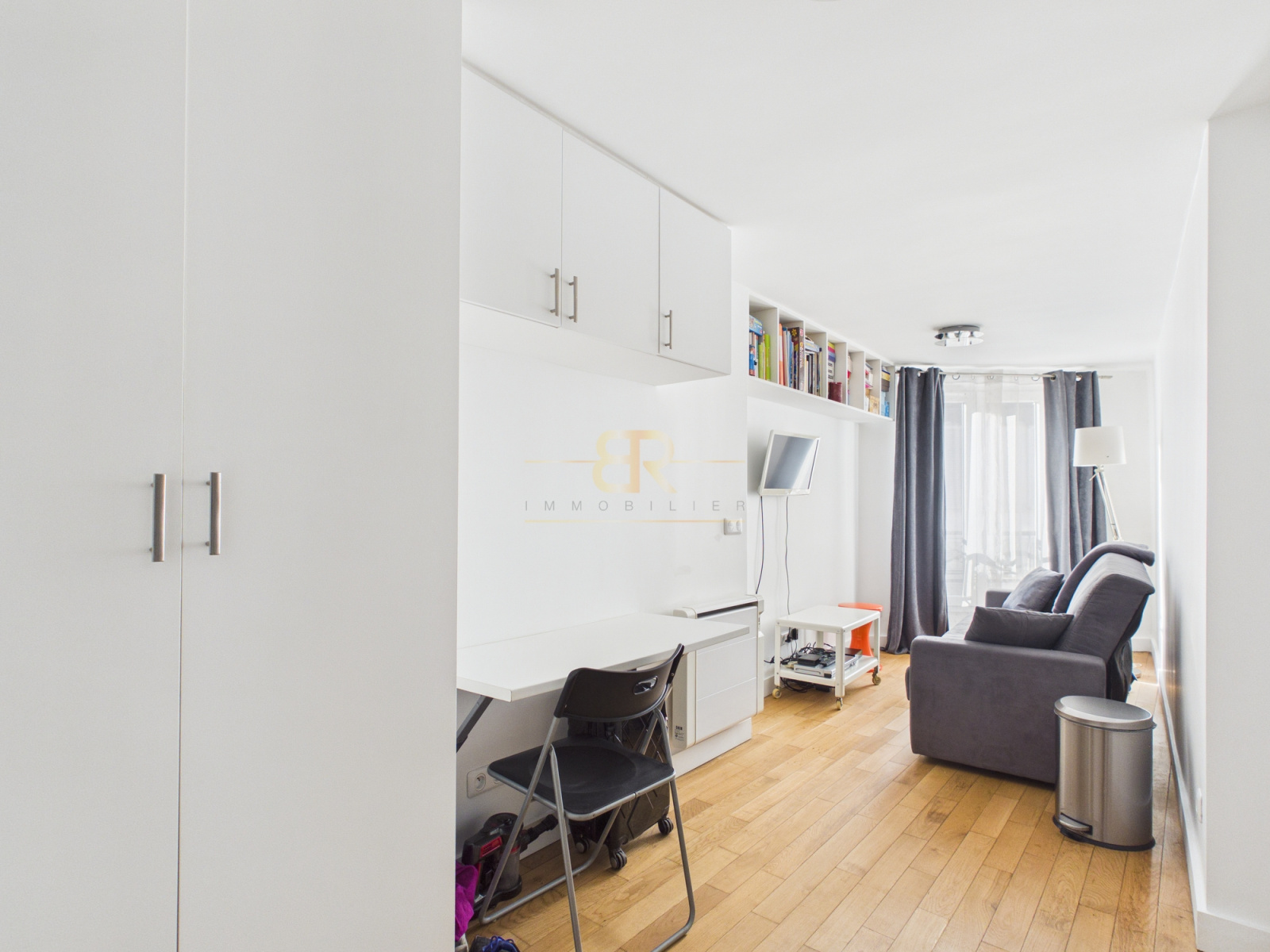 Ce studio de 16,68 m² Carrez, bien agencé, se compose d’une petite entrée donnant accès à un espace cuisine équipée avec machine à laver, de placards sur mesure ainsi que d’un espace de vie avec canapé-lit et table basse. En face de l’entrée se trouve une salle d’eau avec douche et WC.