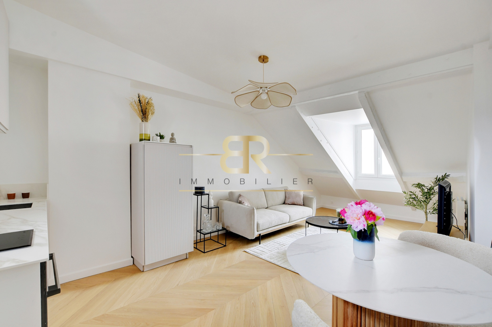 Un vaste séjour de 21 m² au sol traversant Est-Ouest, baigné de lumière, avec cuisine ouverte entièrement équipée (plaques, lave-linge, réfrigérateur, four)