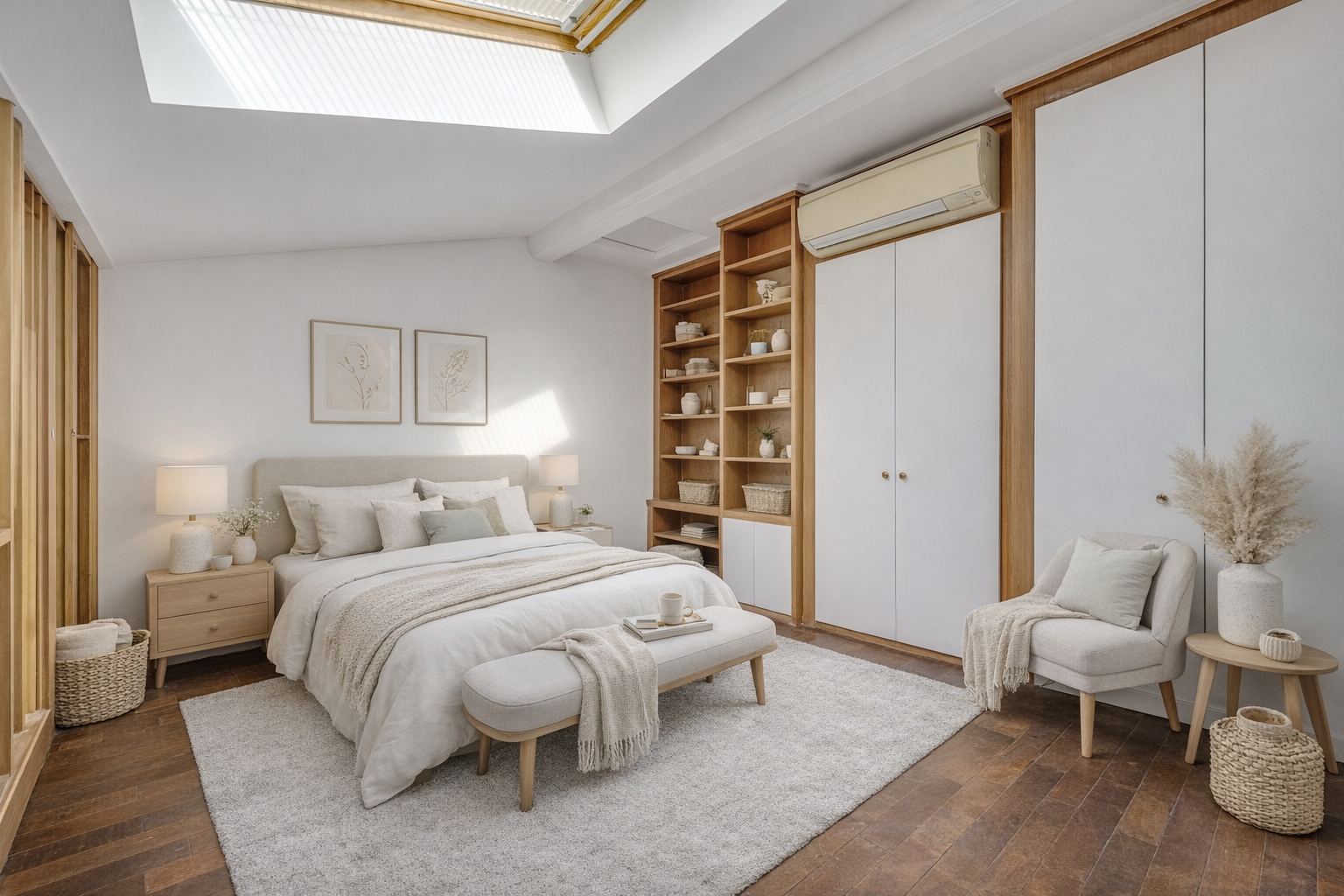 À l'étage, la chambre bénéficie d'équipements pensés pour le confort : vélux avec store électrique, climatisation et rangements intégrés. La salle de bains, également rénovée récemment, se compose d'une douche et de WC.