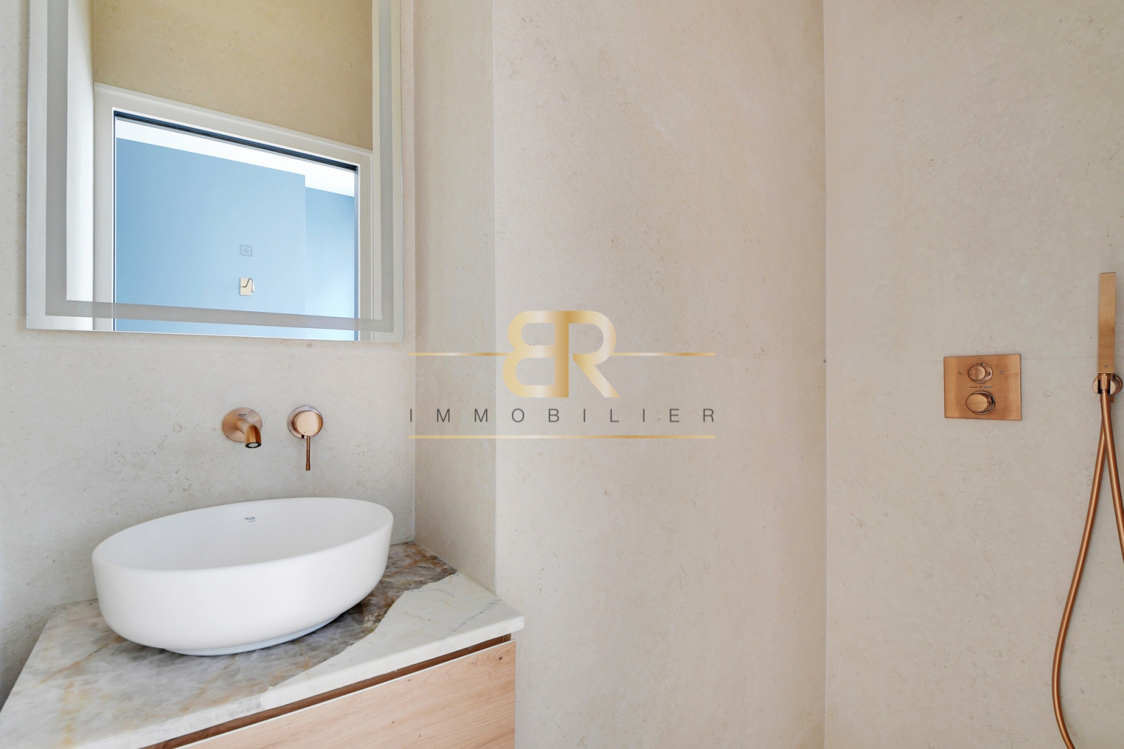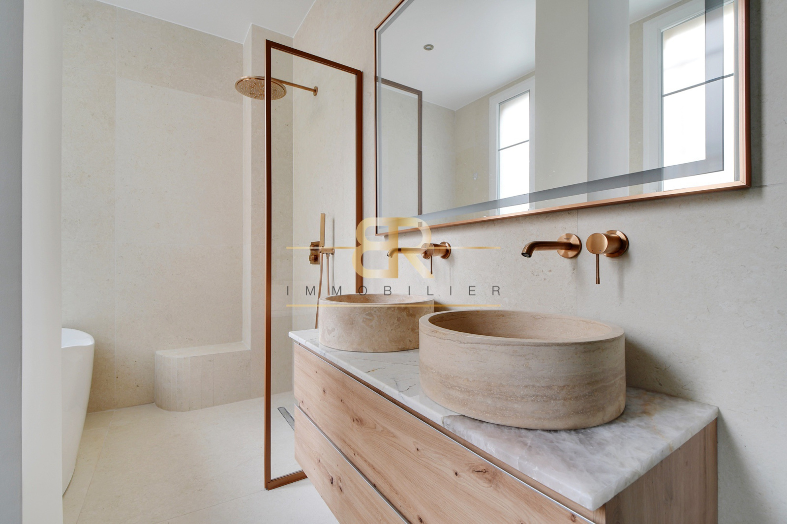 La suite parentale, généreuse et lumineuse, comprend un véritable dressing sur mesure, ainsi qu’une somptueuse salle de bain attenante aux accents contemporains : baignoire îlot sculpturale, douche à l’italienne, double vasque en pierre naturelle posé sur marbre brut, et WC.