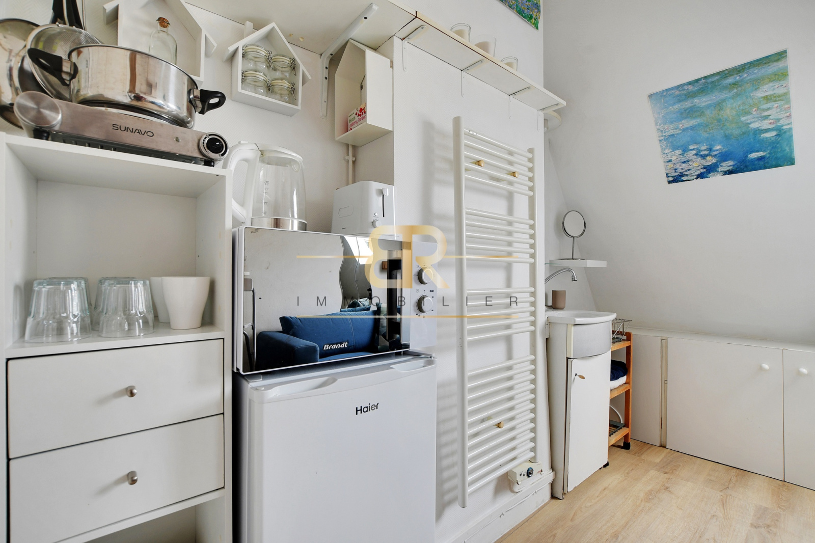 Idéal pied-à-terre! Située rue de Vienne, sous les toits de Paris, au 6ème et dernier étage d'un bel immeuble Haussmannien, nous proposons en exclusivité cette studette/chambre de 9,7m2 habitables, 6,5m2 en loi carrez. Refaite à neuf et vendue entièrement meublée, elle se compose d'une pièce de vie principale, avec canapé-lit, d'une kitchenette aménagée, d'une table avec chaises hautes et d'un lavabo avec raccordement pour une douche d'appoint. Parfaitement agencée, aucune perte d'espace et nombreux rangements. Toilettes sur le palier. Charges de copropriété 55€/mois. Taxe foncière 37€/an.