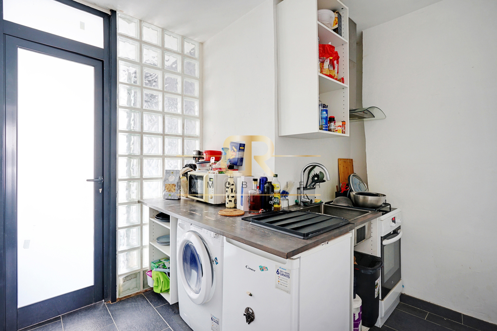 Comprenant une entrée avec cuisine, un salon de 12 m², une salle d'eau avec WC et une Cave.