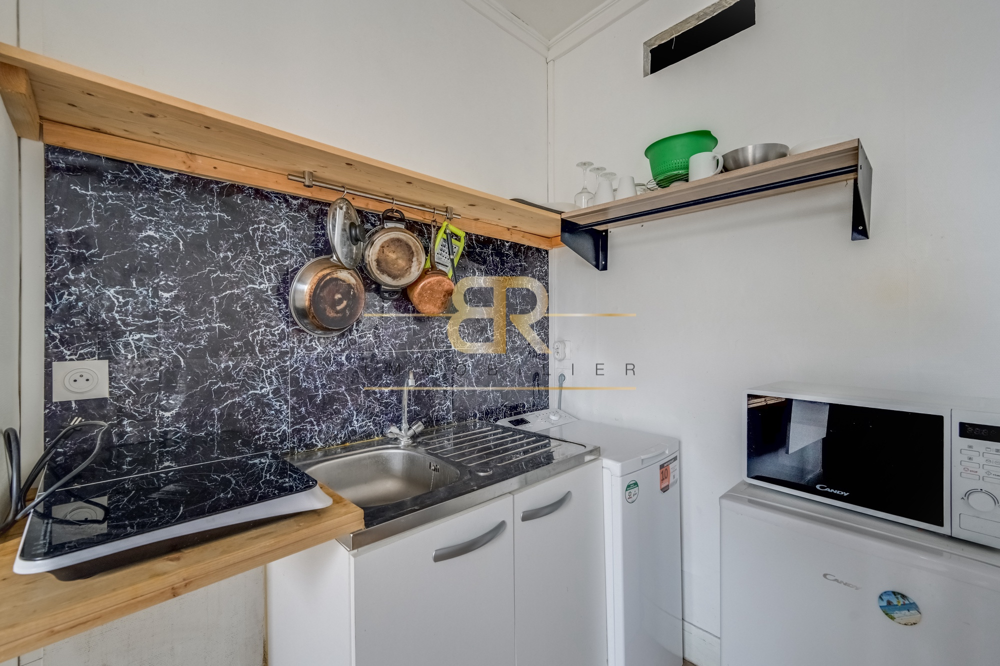Ce bien possède une pièce de vie avec kitchenette, une salle d'eau avec WC (sanibroyeur).