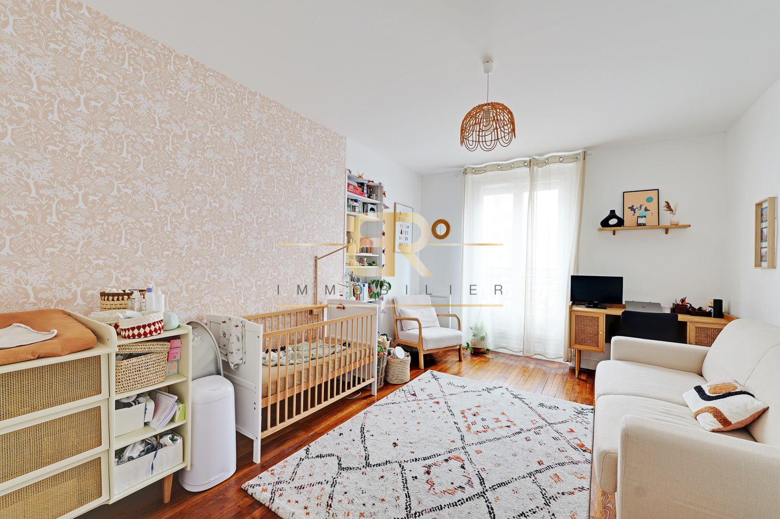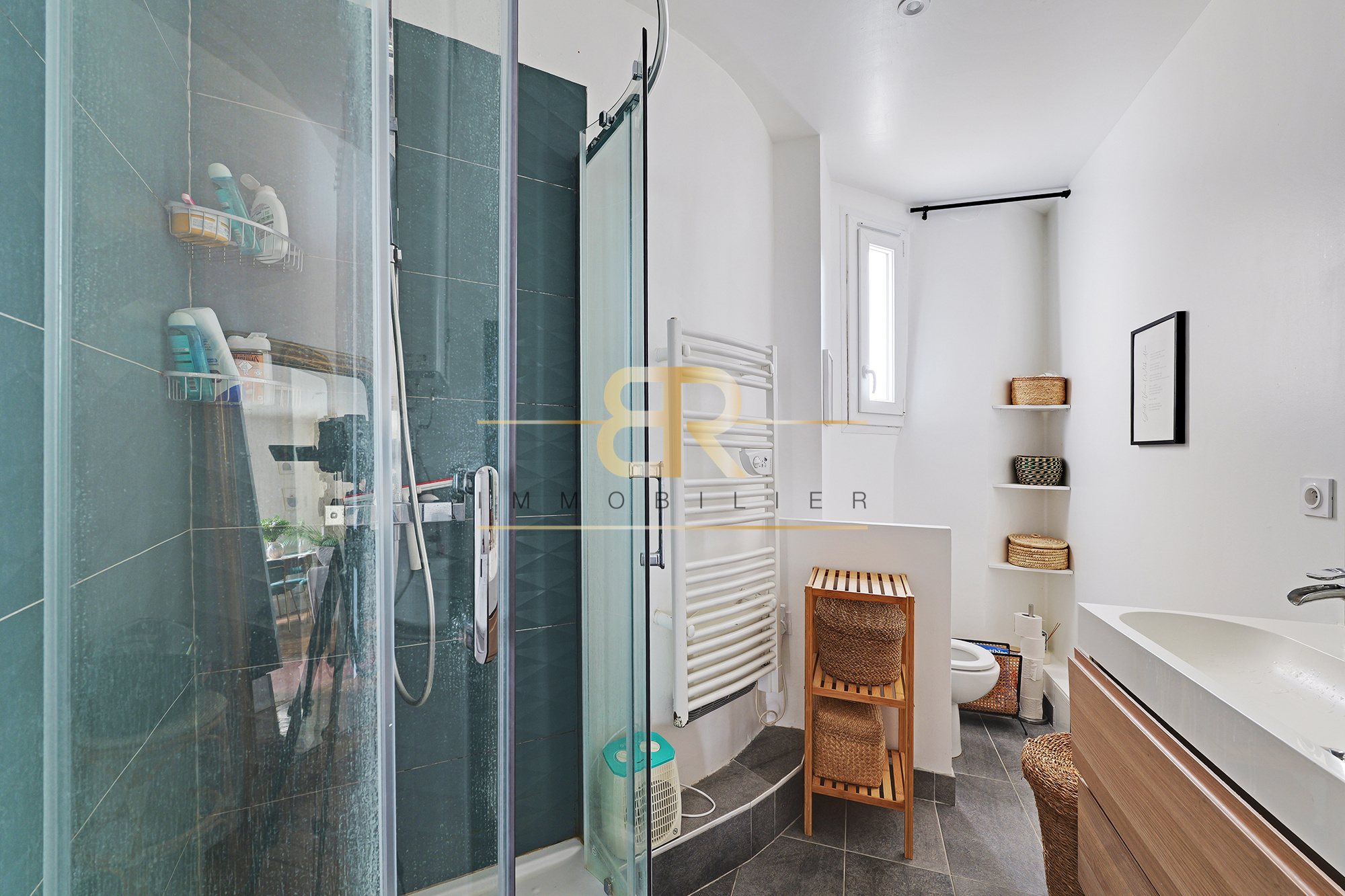 L’appartement se trouve au 2ème étage d’un immeuble de caractère de 4 étages, sécurisé par digicode, interphone et alarme. L’appartement dispose également d’une cave en sous-sol et d’un grand local vélos et poussettes sécurisé au rez-de-chaussée.