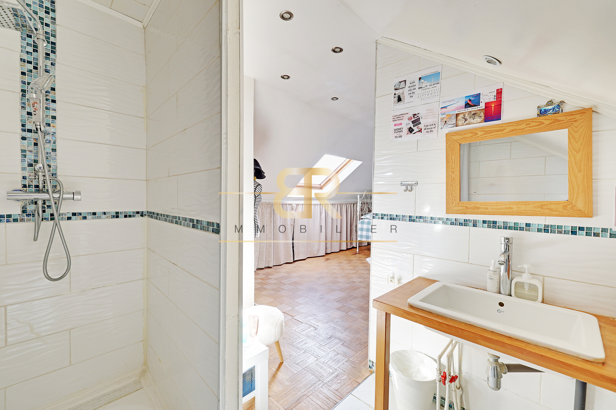Le rez-de-chaussée comprend une grande pièce de vie avec séjour, salle à manger et cuisine ouverte, donnant sur l’extérieur. À l’étage, vous trouverez trois chambres et une salle de bain, ainsi qu’une suite parentale aménagée dans les combles.