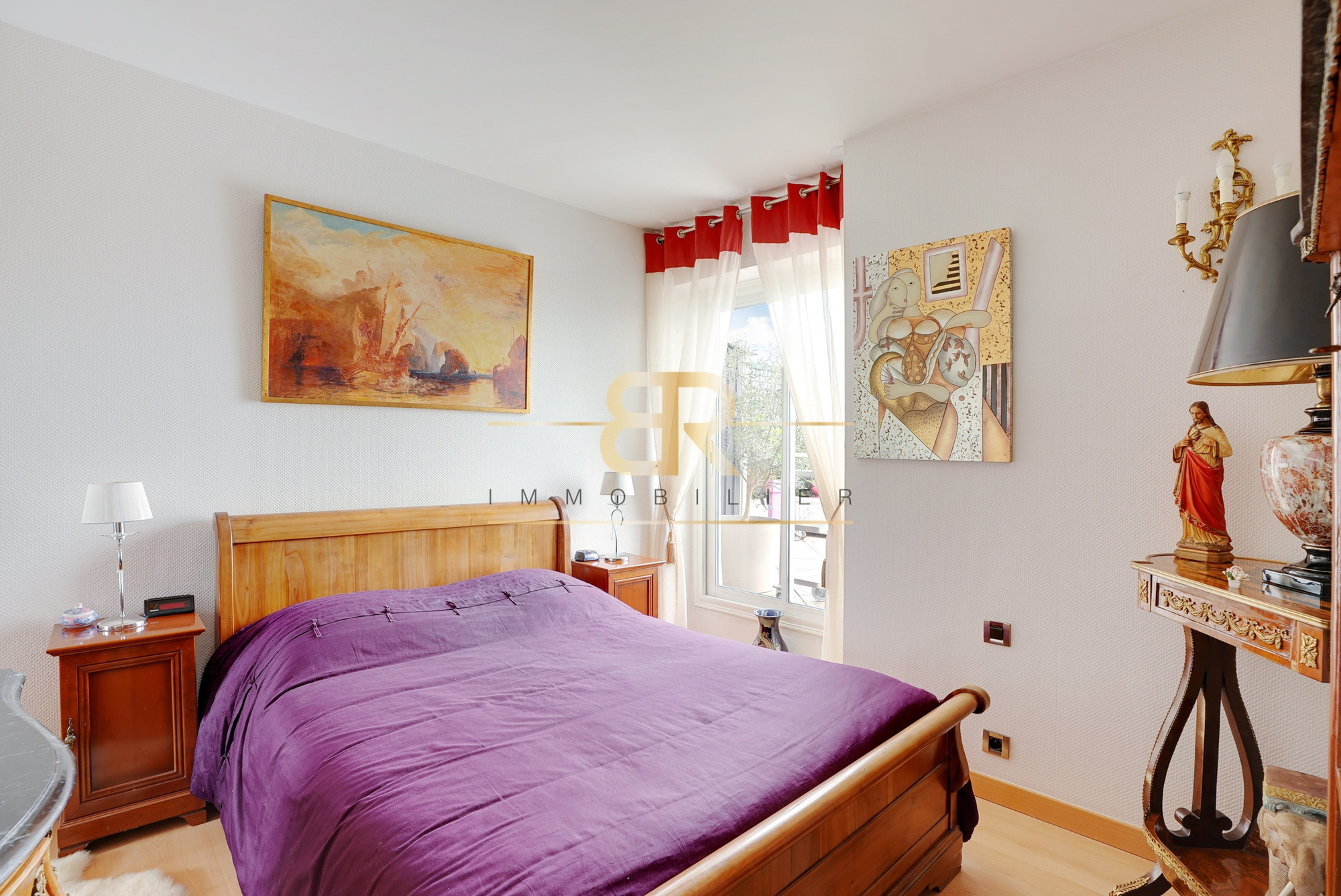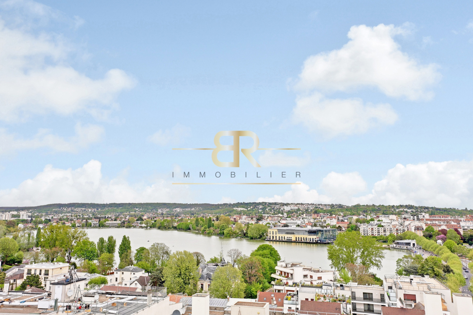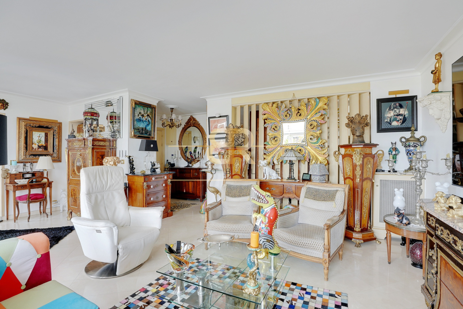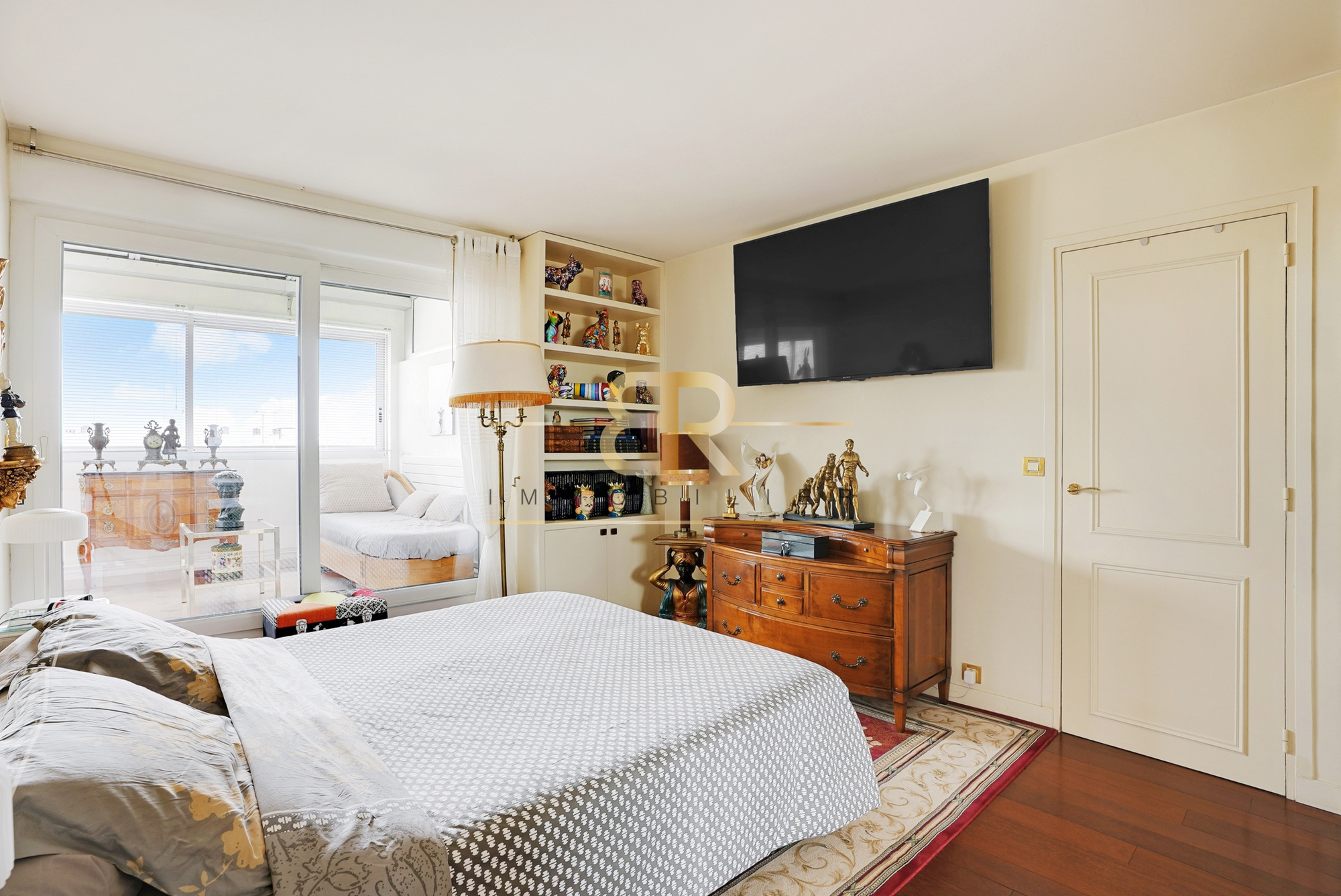 Vaste double séjour baigné de lumière, décoré avec goût, ouvrant sur un balcon de 10 m² avec une vue imprenable sur Paris, ses monuments, et le lac