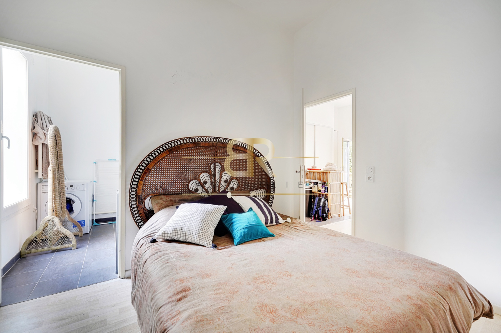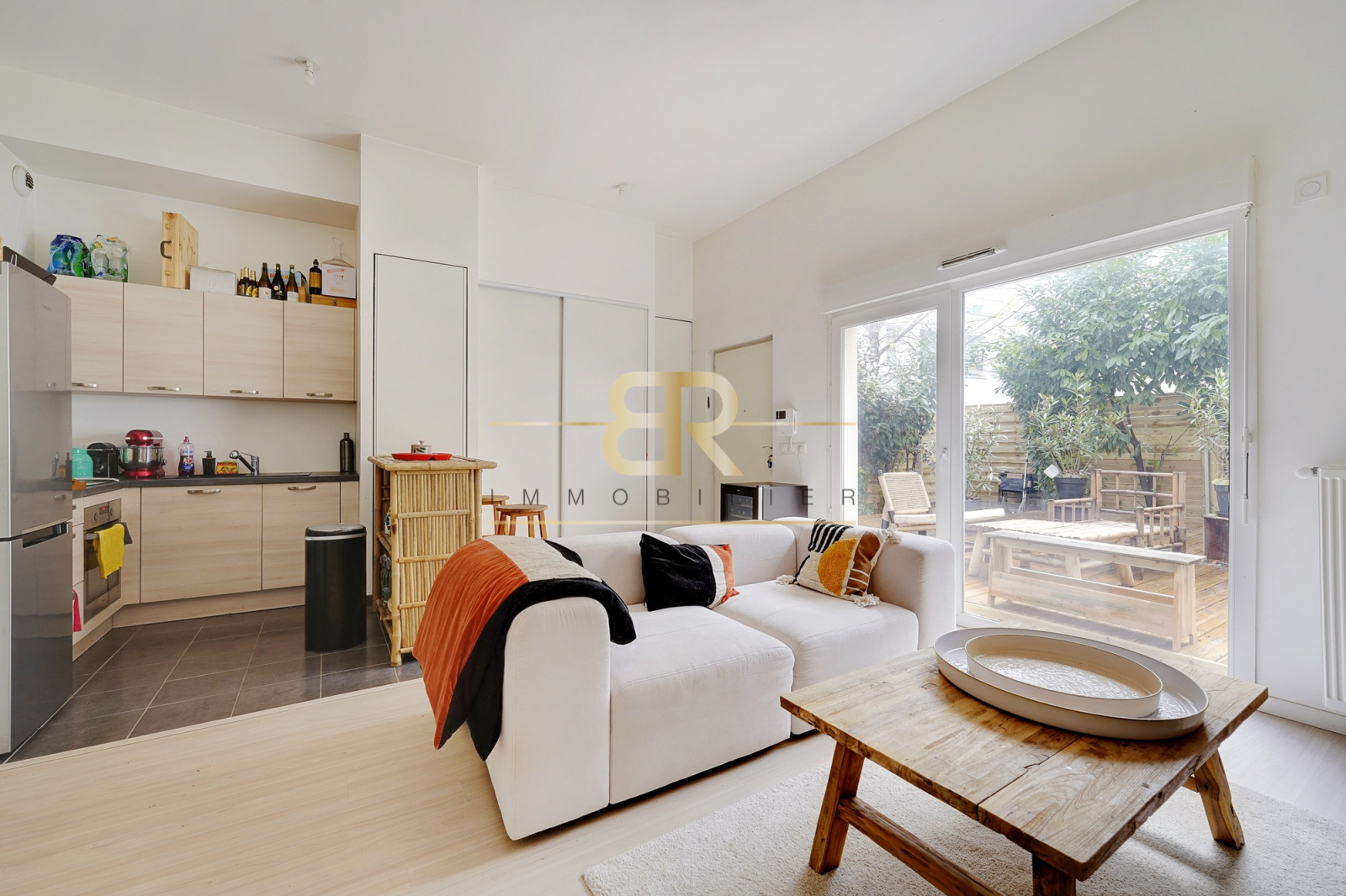 Le séjour est un espace de vie confortable et lumineux, grâce à une grande baie vitrée donnant sur la terrasse. La cuisine américaine offre un lieu de partage et de convivialité.