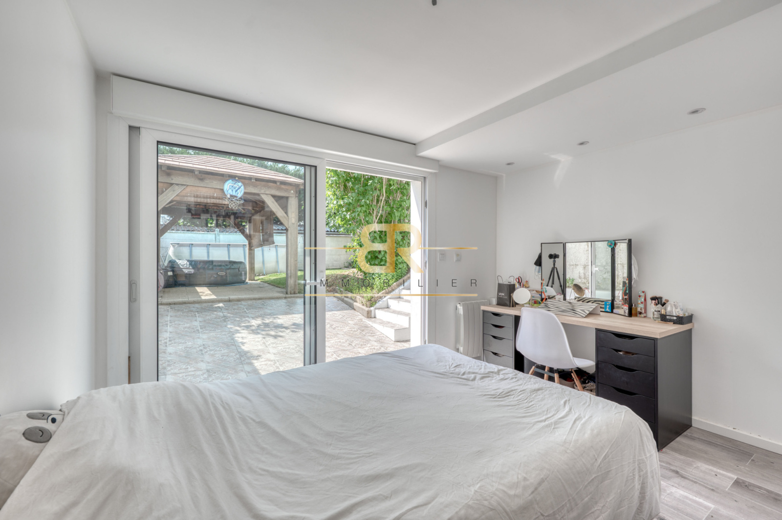 Au rez-de-jardin, vous trouverez une BELLE chambre LUMINEUSE avec de grandes baies vitrées et accès au jardin.
