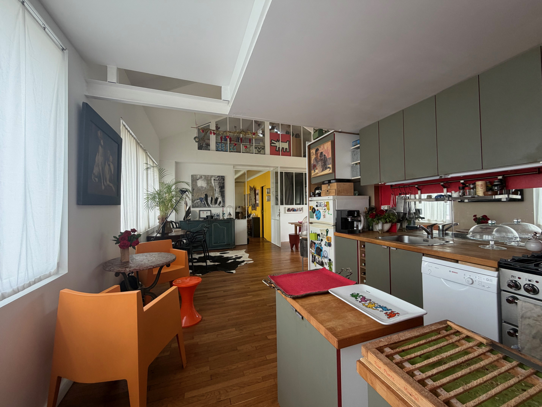 COUP DE CŒUR ABSOLU ! RARE ! Aux PORTES DE PARIS et à 8 minutes à pied du MÉTRO PIERRE ET MARIE CURIE (Ligne 7) et du RER C, dans une copropriété VERDOYANTE, FLEURIE, CALME et très bien entretenue, le Cabinet BR Immobilier vous propose cette MAISON/LOFT EN ÉTAT PARFAIT conçue par un ARCHITECTE, avec TERRASSE et BALCON, ALLÉE PRIVATIVE et PLACE DE STATIONNEMENT. Cette MAGNIFIQUE MAISON/LOFT répartie sur TROIS NIVEAUX a une surface pondérée à 161m2 (134,5 m2 Loi Carrez, 167m2 au Sol + un balcon de 20m2 pondéré à 8m2 sur l’ensemble). On y accède en rez-de-chaussée par une TERRASSE PRIVATIVE. Il se compose d’une ENTRÉE (avec WC séparés sur la droite), d’une pièce en VERRIÈRE qui peut servie d’ATELIER, de BUREAU, ou de CHAMBRE. Derrière une paroi, un STUDIO indépendant de 28m2 est aménagé avec un SALON, une CUISINE OUVERTE et ÉQUIPÉE, une CHAMBRE et UNE SALLE d’EAU avec WC. À conserver ainsi ou à ouvrir. Un ESCALIER en béton ciré mène au PREMIER NIVEAU; vous arriverez sur une CUISINE OUVERTE et ÉQUIPÉE donnant sur une IMMENSE PIÈCE de VIE TRAVERSANTE et baignée de LUMIÈRE qui permet d’accéder directement au BALCON/TERRASSE de 20m2. D’un côté de cette pièce, sur la droite, se trouve la SALLE de BAIN avec WC séparée et un deuxième escalier conduit au 2ème niveau composé ici d’une CHAMBRE sous le toit. De l’autre côté, sur la gauche, vous entrerez par une PORTE VITRÉE à un SALON et une CHAMBRE. Un troisième escalier monte à une autre CHAMBRE/BUREAU sous le toit.