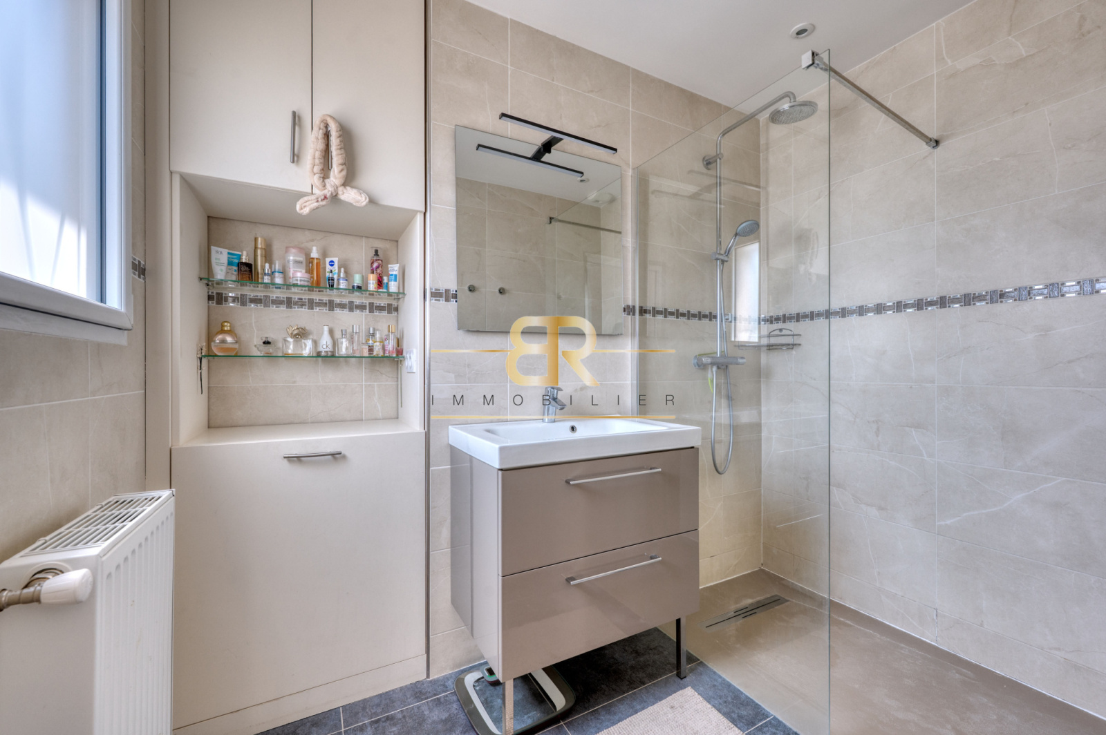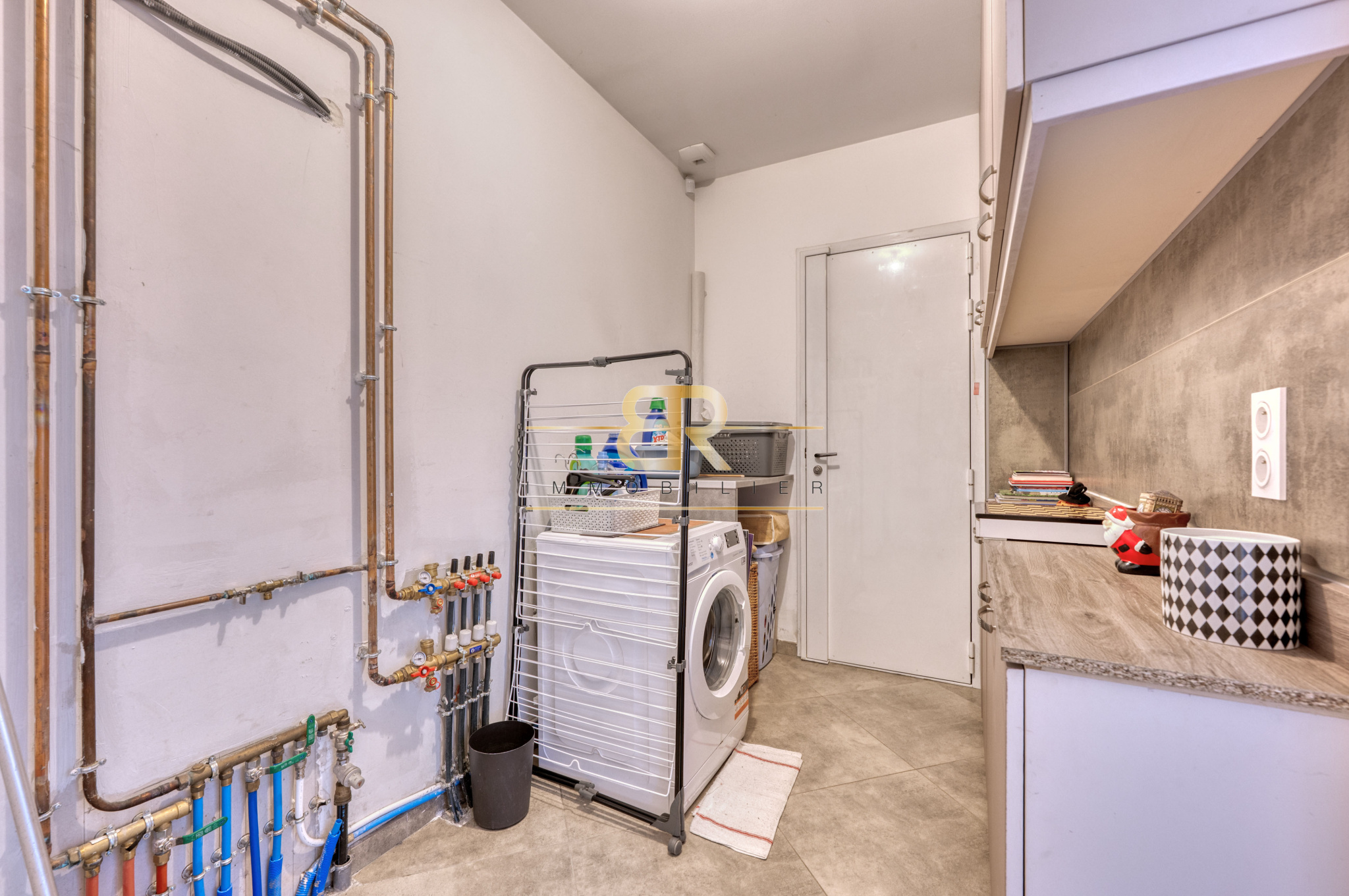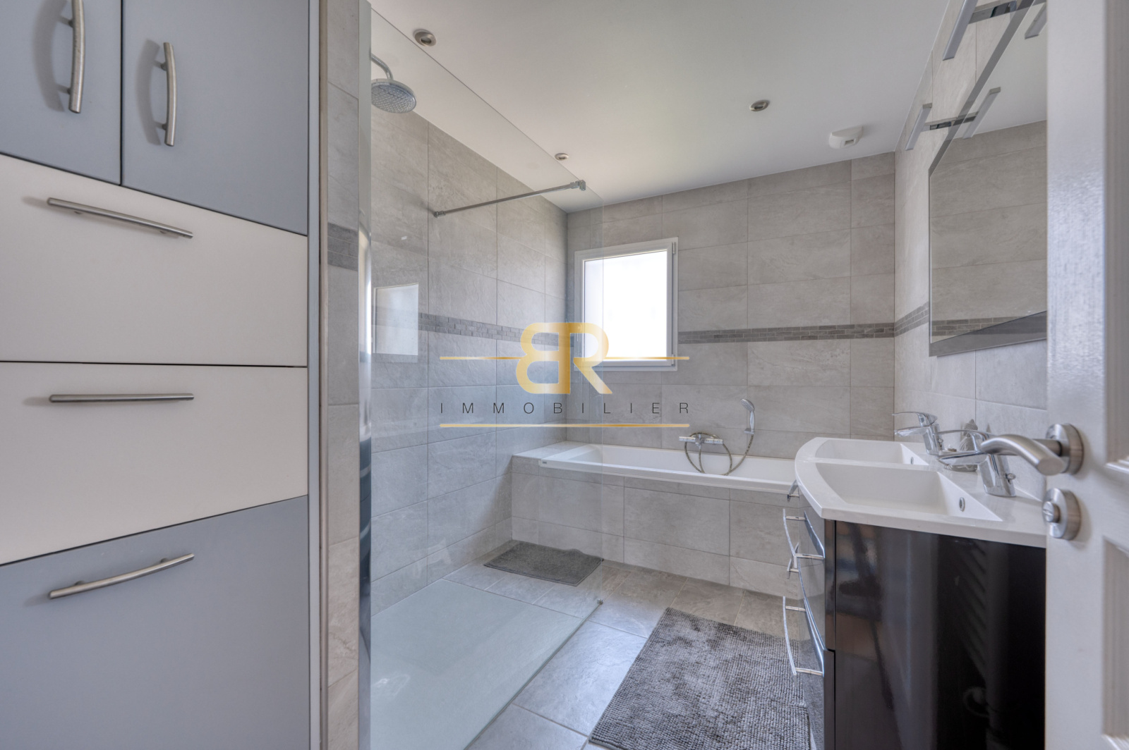 Au rez-de-chaussée, l’entrée dessert un séjour / salle à manger, une cuisine AMÉRICAINE équipée avec un CELLIER attenant (espace buanderie), un WC séparé avec lave-mains. Le tout donnant accès à une TERRASSE de 30m2 et un jardin ARBORÉ de 401m2.