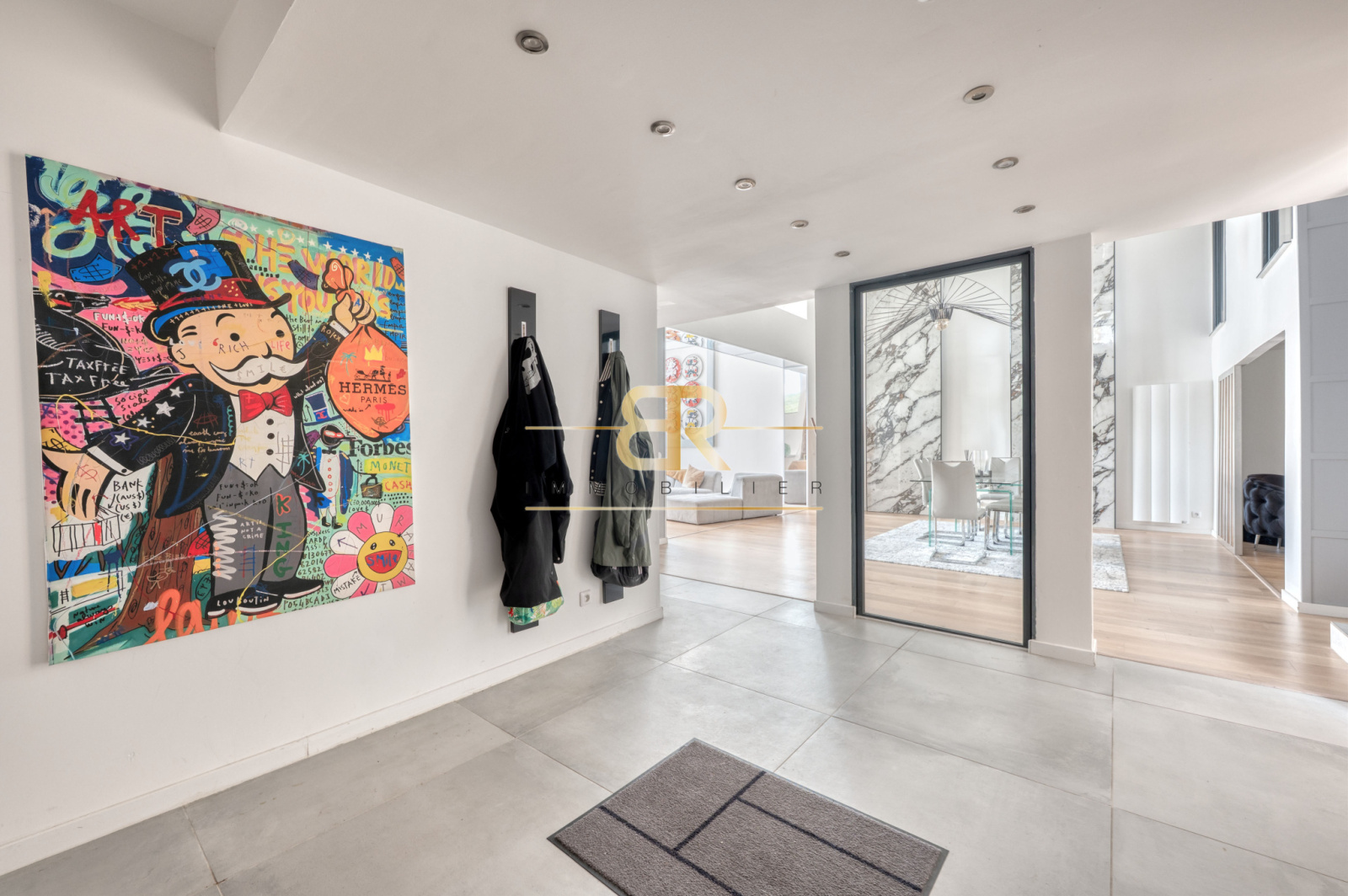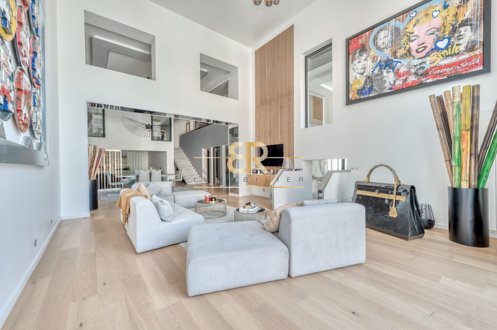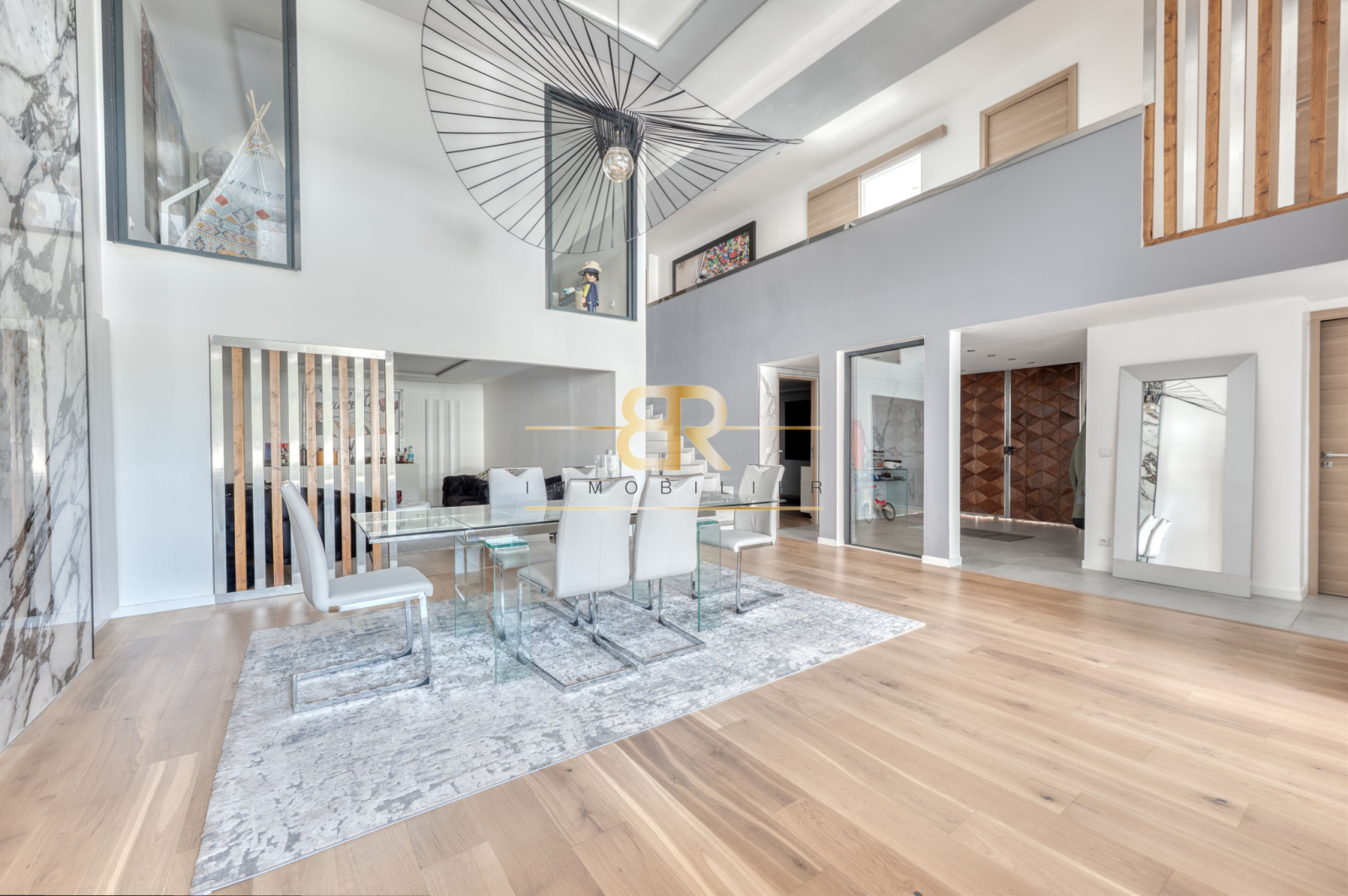 Au rez-de-chaussée : une entrée s’ouvrant sur un MAGNIFIQUE triple séjour - salle à manger spacieux et baigné de lumière de 100m2 avec une MAGNIFIQUE HAUTEUR SOUS PLAFOND de 7m. Ce séjour offre un accès à une TERRASSE de 100m2 avec vue sur la piscine. Vous aurez la possibilité de bénéficier d’un second séjour, plus intimiste.