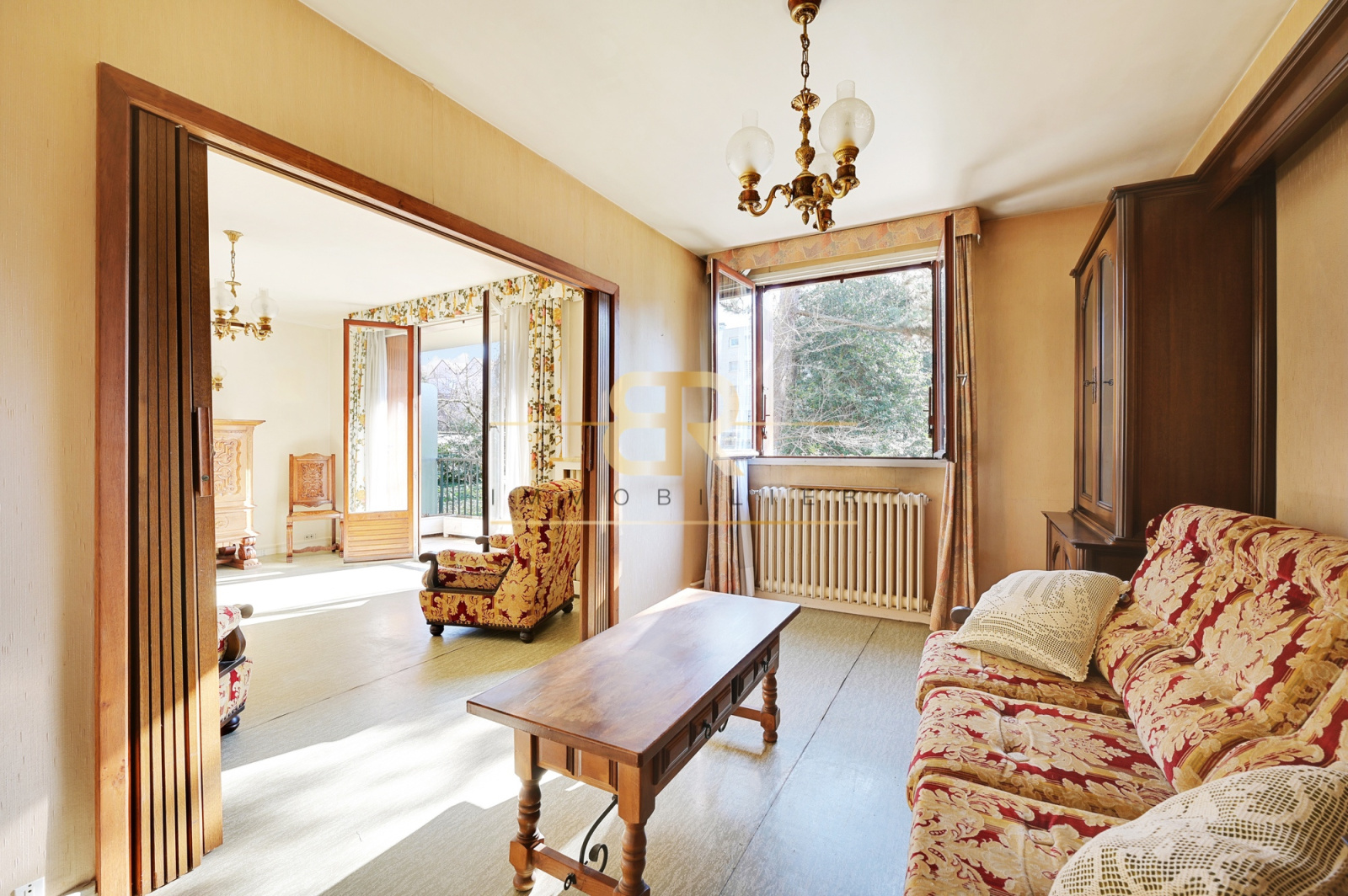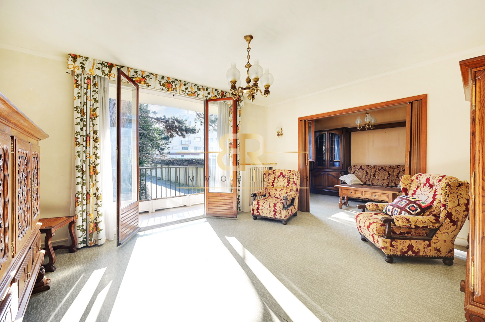 CHEVILLY-LARUE - Le Cabinet BR Immobilier vous propose un appartement TRAVERSANT et LUMINEUX de 78m² carrez avec un BALCON de 5m2 (vue dégagée et arborée), situé dans une résidence calme et verdoyante au REZ-DE-CHAUSSÉE SURRELEVE d'un immeuble de 1965. L'appartement se compose d'une entrée avec un plan en étoile desservant un double-séjour de 30 m² exposé SUD-EST, une cuisine SÉPARÉE et SEMI-ÉQUIPÉE, DEUX chambres (exposition OUEST) avec PLACARDS intégrés SUR-MESURE, possibilité de créer une troisième chambre dans le double séjour, une salle de bains et un WC SÉPARÉ. Un dégagement avec dressing est un avantage en termes d'OPTIMISATION de RANGEMENTS pour cet appartement COUP DE COEUR. Un box et DEUX caves complètent cette offre. À proximité des transports, des commerces, des écoles et du centre-ville. Charges : 280€/mois (eau froide, chauffage, entretien PC, entretien du jardin). Taxes foncières : 1451€/an.